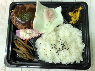 ジューシーで大きなハンバーグに目玉焼き、デミグラソースのかかったお弁当です。